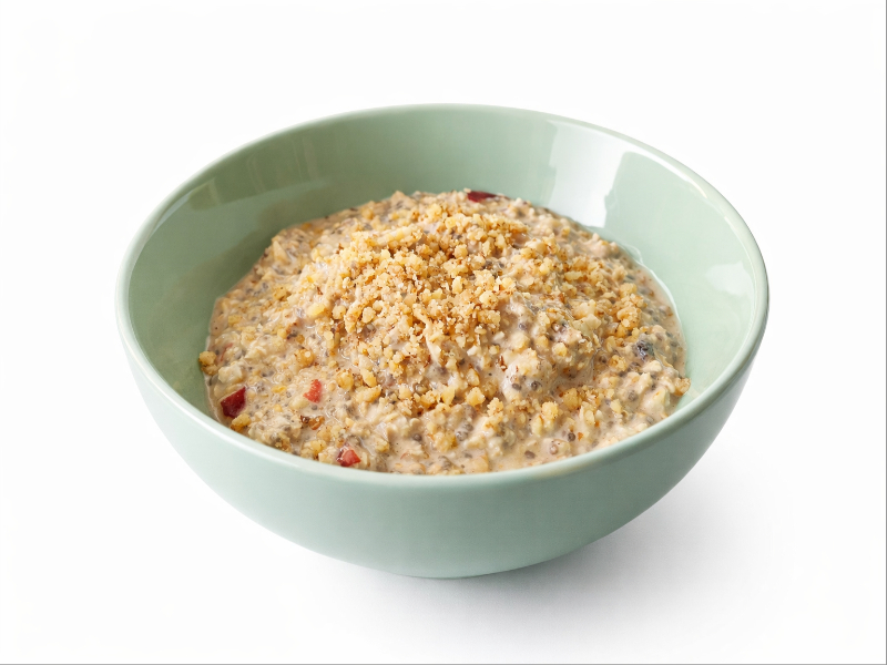Dieses Frühstück ist ausgewogen zusammengesetzt und versorgt dich am Morgen mit allem, was du für einen guten Start in den Tag brauchst. Haferflocken liefern komplexe Kohlenhydrate und Ballaststoffe, die für eine gleichmäßigere Energieversorgung sorgen. Sojadrink, Soja-Skyr und veganes Proteinpulver erhöhen den Eiweißgehalt deutlich und unterstützen Sättigung, Muskelerhalt und Regeneration. Leinsamen und Nüsse ergänzen das Rezept mit wertvollen ungesättigten Fettsäuren und sorgen zusammen mit den Ballaststoffen für eine gute Bekömmlichkeit.
